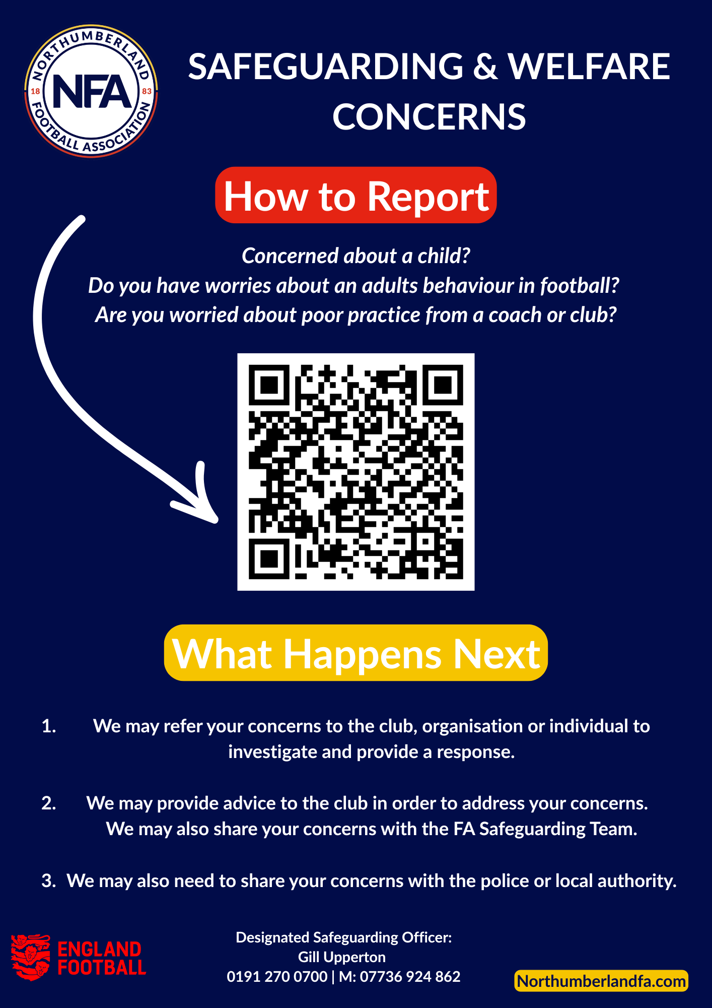 • contact The FA Safeguarding Team on 0800 169 1863 or Safeguarding@TheFA.com