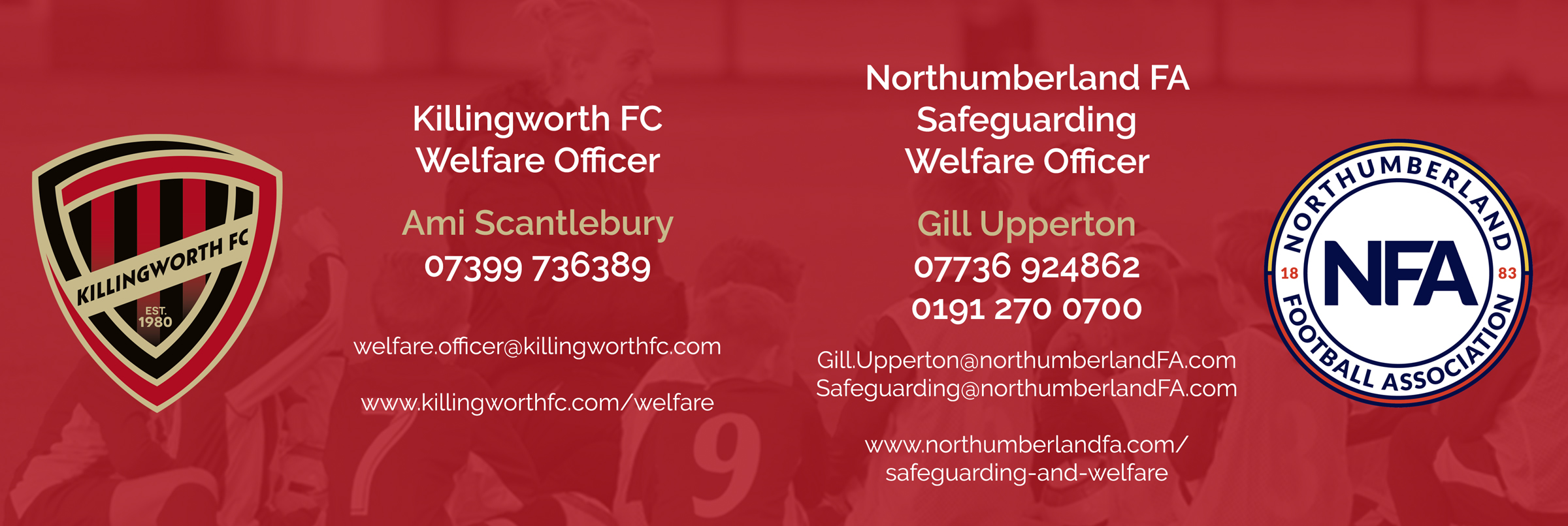 The welfare of the children and everyone who plays football within our facilities is paramount to what we do at Killingworth FC. We have dedicated Welfare Officers and adhere to all polices that are there for the protection of everyone. Killingworth FC acknowledges its responsibility to safeguard the welfare of every child and young person who has been entrusted to it's care and is committed to working to provide a safe environment for all members.